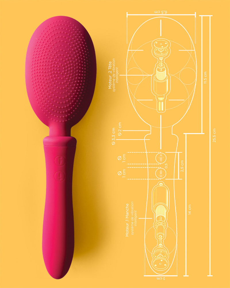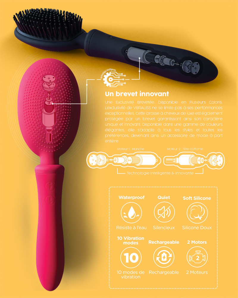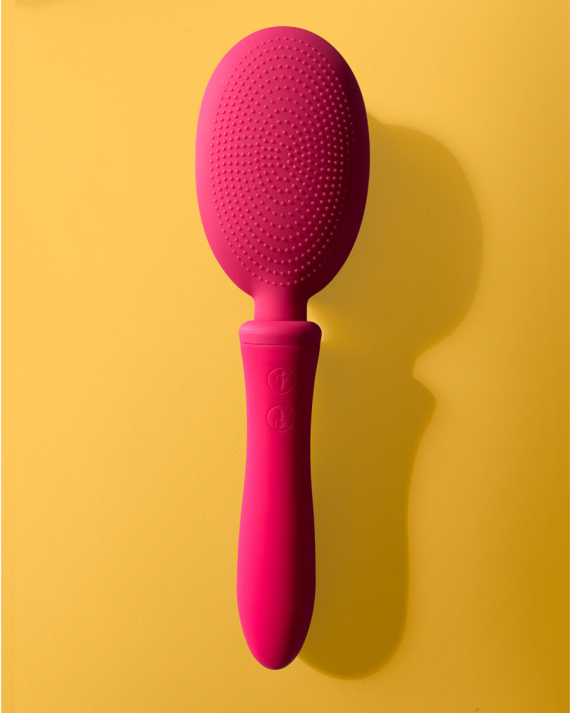 In the brush head: soothing scalp massage, muscular relaxation… or gently suggestive pleasure with deep, enveloping vibrations.