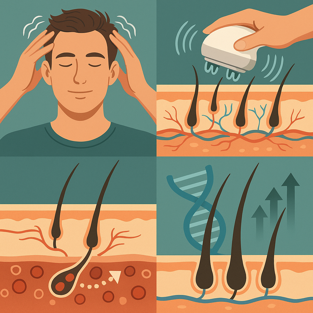 La plupart des études académiques parlent de massage plutôt que de “vibrations” au sens strict. Mais d’un point de vue biologique, les deux approches partagent un point commun essentiel : elles créent une stimulation mécanique contrôlée sur le cuir chevelu et les follicules.